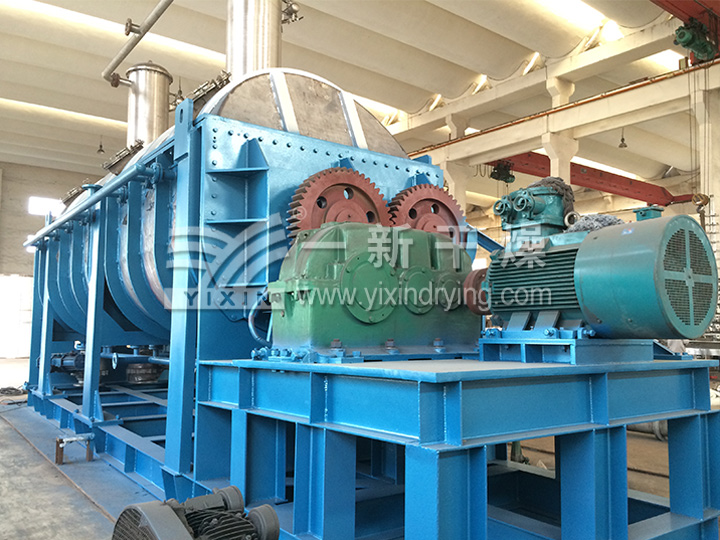 空心軸上密集排列著楔型中空槳葉,熱介質蒸汽經空心軸流經槳葉,單位有效容積內傳熱面積很大。傳熱介質通過旋轉接頭,流經殼體夾套及空心攪拌軸,空心攪拌軸依據熱介質的類型而具有不同的內部結構,以保證^佳的傳熱效果。在槳葉及夾套通入熱介質加熱的同時,出料口上部同時進行抽濕,這樣大大增加了設備的干燥強度。蒸發出來的水份由抽濕風機帶出干燥機。