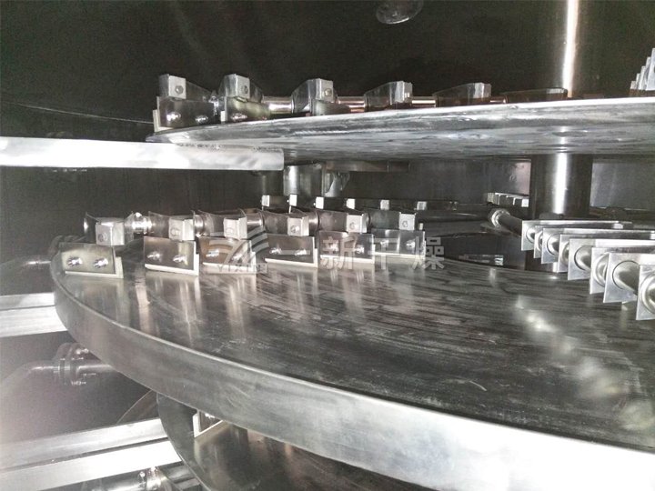 此次我司在原有的盤式干燥機上進行了細節調整,使之能更好的干燥氫氧化鋰。首先,設備耙葉部分更改了連接結構,具有很高的靈活性,方便根據物料比重而進行調整,同時這樣的設計在檢修更換耙葉的時候不需要拆耙桿;由于電池材料粉粒徑較細,各層物料降落過程中非常容易掉入底層,干燥不均勻又會使細粉滲入軸承。我公司針對此情況進行了特殊改進,在底層出料盤中間增加了迷宮密封,讓上盤面物料降落時沿錐體順利的滑落進入出料盤,絕了微粉進入軸承的情況發生;其次,同行業廠家設計的盤式干燥機熱源為單進口,盤內熱源存在短路現象,盤面上的物料受熱不均勻。而我公司設計為雙(多)進、雙(多)出,使熱源分配進出時更加均勻,盤面物料吸熱更加充分,使熱效率大大提高。