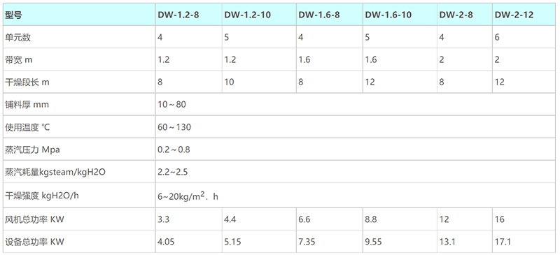 帶式干燥機由若干個獨立的單元段組成。每個單元段包括循環風機、加熱裝置、單獨或公用的新鮮空氣抽入系統和尾氣排出系統。對干燥介質數量、溫度、濕混度和尾氣循環量操作參數。可進行獨立控制,人而保證帶式干燥機工作的可靠性和操作條併的優化。帶干機操作靈活?濕物進料。干燥過程在完全密封的箱體內進行。勞動條件較好。免了粉塵的外泄。帶式干燥機是成批生產用的連集式干爆設備。該系列干燥機具有干燥速度快蒸發強度高、產品質量好的優點。對脫水濾餅類的膏狀物料,需經造粒或制成條狀后進入網帯連續干燥。網帶可以有單層式、多層式,増加行程使單位面積擴大,按污泥處理量量身制作。
