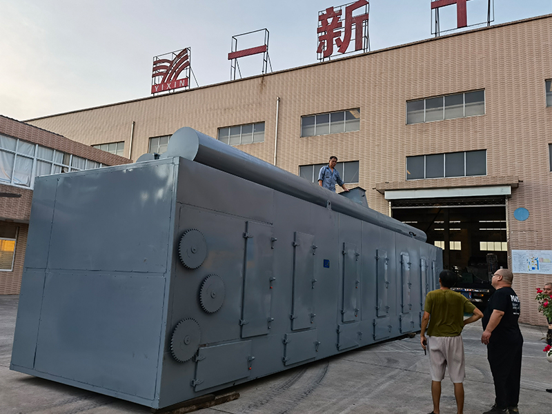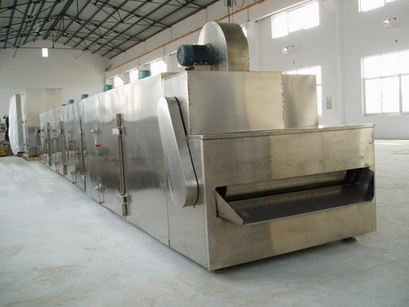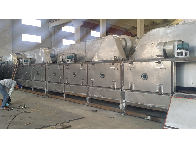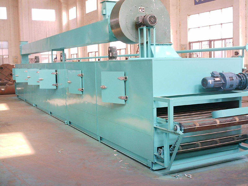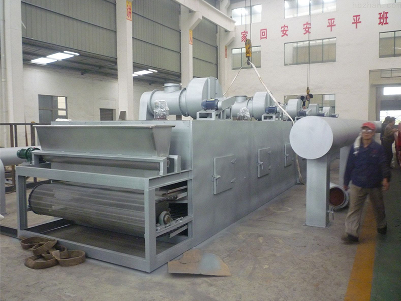 物料由加料器均勻地鋪在網帶上,網帶一般采用12-60目不銹鋼絲網,由傳動裝置拖動在干燥機內移動。干燥機由若干單元組成,每一單元熱風獨立循環,部分尾氣由專門排濕風機排出,廢氣由調節閥控制,熱氣由下往上或由上往下穿過鋪滿物料的網帶完成熱量與質量傳遞的進程,帶走物料水份。網帶緩慢移動,運行速度可根據物料溫度自由調節,干燥后的成品連續落入收料器中。上下循環單元根據用戶需要可靈活配備,單元數量亦可根據需要選取。